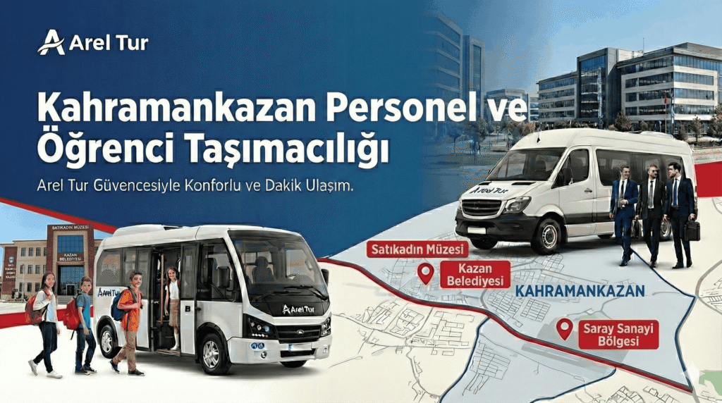 Çalışanlarınızın ve öğrencilerimizin her sabah bu uzun mesafeyi yorulmadan, güvenle kat etmesi gerekir. Arel Tur olarak personel taşıma hizmetlerimizde iş gücünüzü Ankara’nın merkez ilçelerinden (Yenimahalle, Keçiören, Sincan) topluyor, turizm paket lüks araçlarımızla Kazan’daki üretim merkezlerine ulaştırıyoruz. Aynı titizliği bölgedeki eğitim kurumları için öğrenci servis ağımızla da sağlayarak velilerimize tam bir huzur veriyoruz.